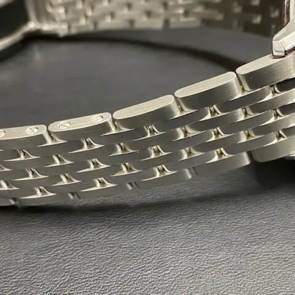 Encased in brushed and polished stainless steel, the watch houses a bidirectional notched bezel with the Navitimer’s iconic slide‑rule function, historically used for flight calculations. The harmonious dial layout presents three contrasting black chronograph subdials (elapsed seconds, 30 minutes, 12 hours) and a framed date at 6 o’clock. Applied baton indices and luminous hands ensure clarity across lighting conditions, while the red-tipped chronograph hand nods to its precision timing heritage.