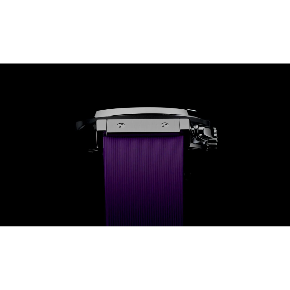 The purple sunray dial stands out with silver-tone chronograph counters, applied indices, and luminous hands for superior legibility. Its 42mm satin-finished titanium case is paired with a black rubber strap lined with purple, ensuring comfort, durability, and bold aesthetics.