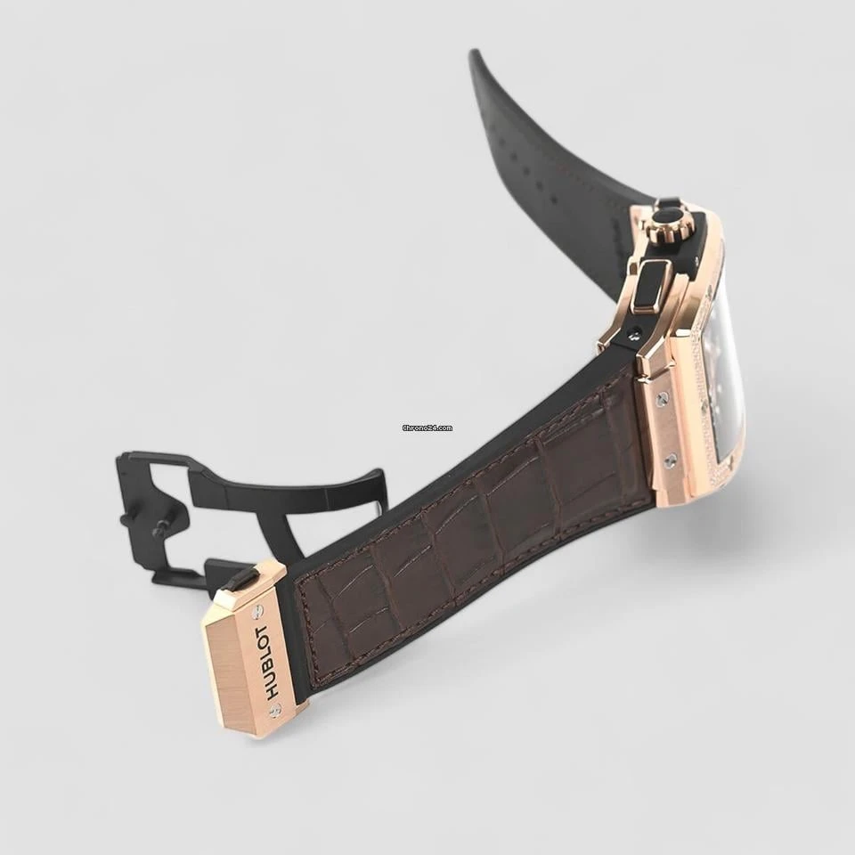 Satin-finished 18kt king gold case with a brown leather strap. Fixed 18kt king gold bezel set with diamonds. Black (skeleton center) dial with luminous king gold hands and index hour markers. Minute markers around the outer rim. Dial Type: Analog. Luminescent hands and markers. Date display between the 4 and 5 o’clock positions. Hublot calibre HUB4700 automatic movement, containing 31 Jewels, composed of 278 parts, bitting at 36000 vph, and has a power reserve of approximately 50 hours. Scratch resistant sapphire crystal. Pull / push crown. Transparent case back. Tonneau case shape. Case dimensions: 51 mm x 45 mm. Deployment clasp. Water resistant at 100 meters / 330 feet. Functions: chronograph, date, hour, minute, second. Spirit Of Big Bang Series. Luxury watch style.